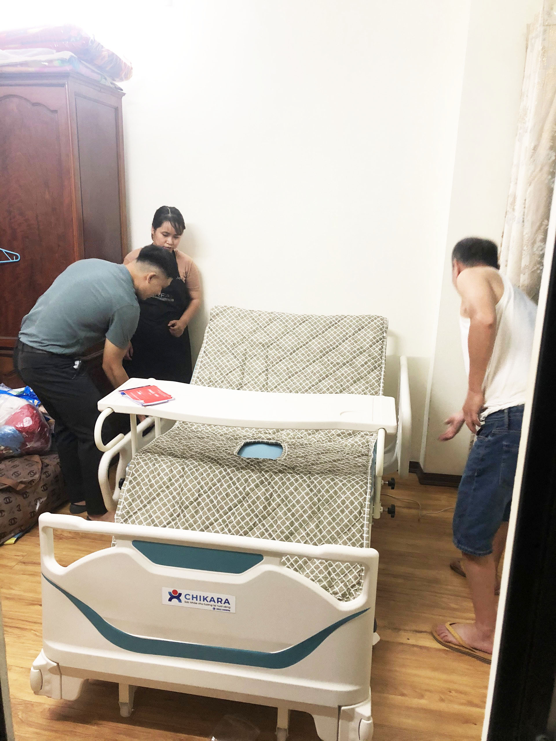 Chị Mai ở Nam Định có bố bị bệnh liệt nằm giường đã lâu, chị gặp rất nhiều vấn đề khó khăn cho việc chăm sóc bố trong cuộc sống hàng ngày. Khi mà chị và tất cả mọi người trong gia đình đều có những công việc riêng bên ngoài thì việc chăm sóc bố sao cho chu toàn là một vấn đề nan giải. Chị tìm hiểu trang website của Chikara để tham khảo giường y tế như đi các đơn vị khác, nhưng sau khi trao đổi với nhân viên tư vấn, nhận thấy sự tiện lợi và hữu dụng của giường y tế đa chức năng Chikara đối với việc chăm sóc bố nên chị đã quyết định mua luôn cho bố chiếc giường y tế đa chức năng Chikara này. Theo như chị có trao đổi, ban đầu chị rất ngại việc lắp đặt giường sẽ khó khăn nhưng khi sản phẩm được giao về tận nhà và có sự hướng dẫn tận tình từ nhân viên chăm sóc khách hàng của Chikara, việc lắp giường đã trở nên rất dễ dàng.